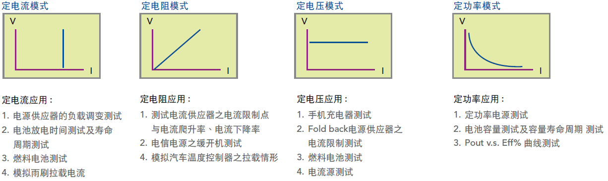 • 定电流、定电阻、定电压及定功率操作模式